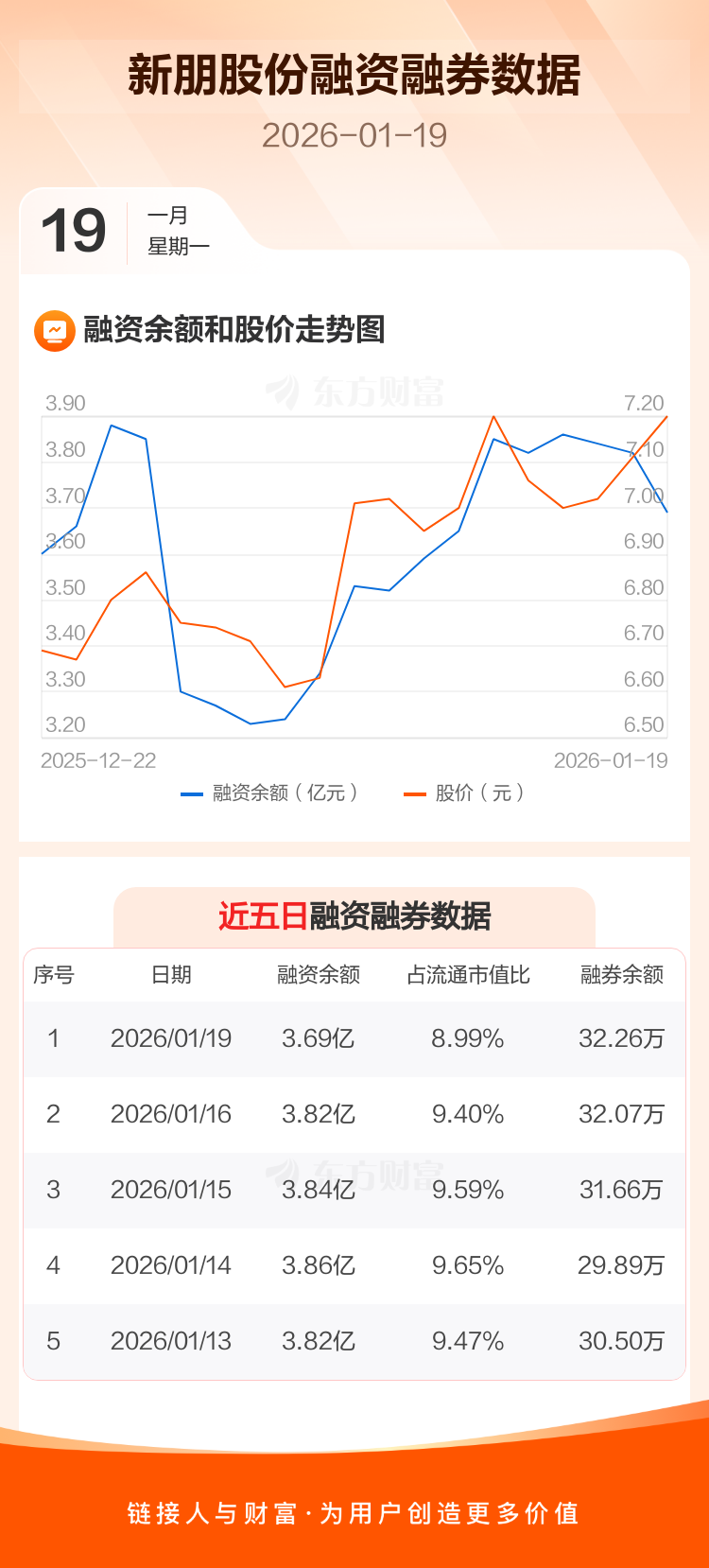 交易所最新数据显示,新朋股份于2026年1月19日获融资买入2240.42万元,融资偿还3463.02万元,当日融资净偿还1222.6万元。目前,该股融资余额3.69亿,占流通市值比例为8.99%。