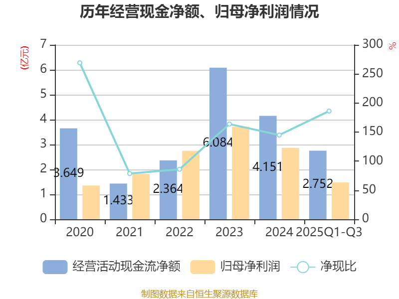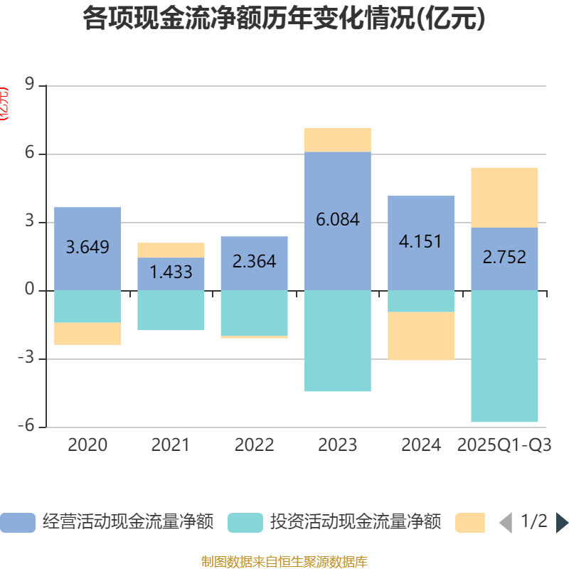 2025年前三季度,公司经营活动现金流净额为2.75亿元,同比增长34.87%;筹资活动现金流净额2.62亿元,同比增加3.9亿元;投资活动现金流净额-5.79亿元,上年同期为-7386.88万元。