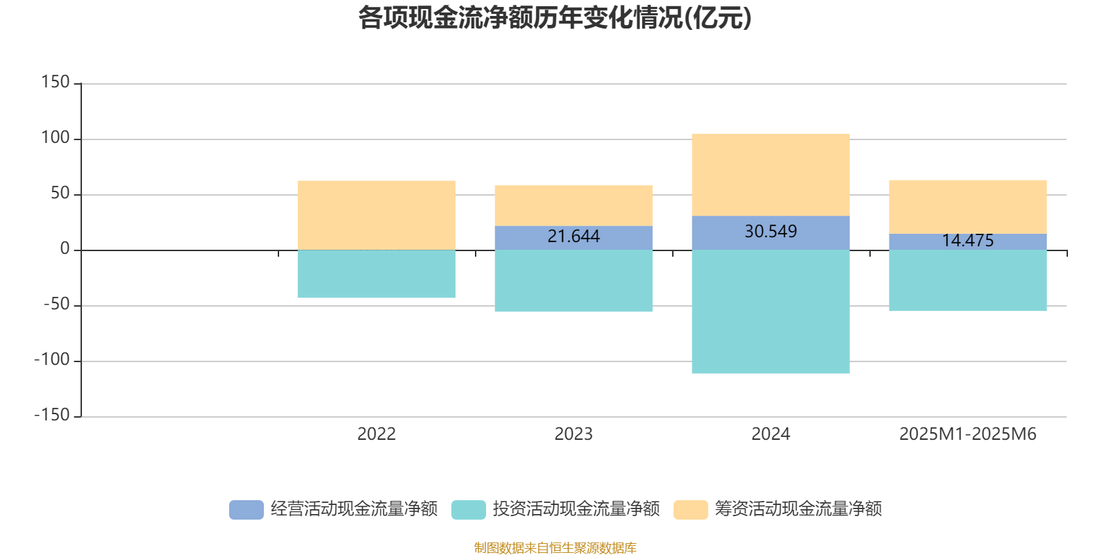 2025年1月至6月,公司经营活动现金流净额为14.48亿元,同比增长9.69%;筹资活动现金流净额48.15亿元,同比增加22.57亿元;投资活动现金流净额-55.08亿元,上年同期为-58.28亿元。
