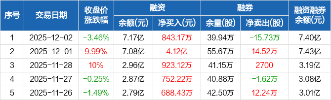 融资方面,当日融资买入1.9亿元,融资偿还1.82亿元,融资净买入843.17万元,连续5日净买入累计4.44亿元。融券方面,融券卖出4700股,融券偿还16.2万股,融券余量39.94万股,融券余额2393.2万元。融资融券余额合计7.4亿元。