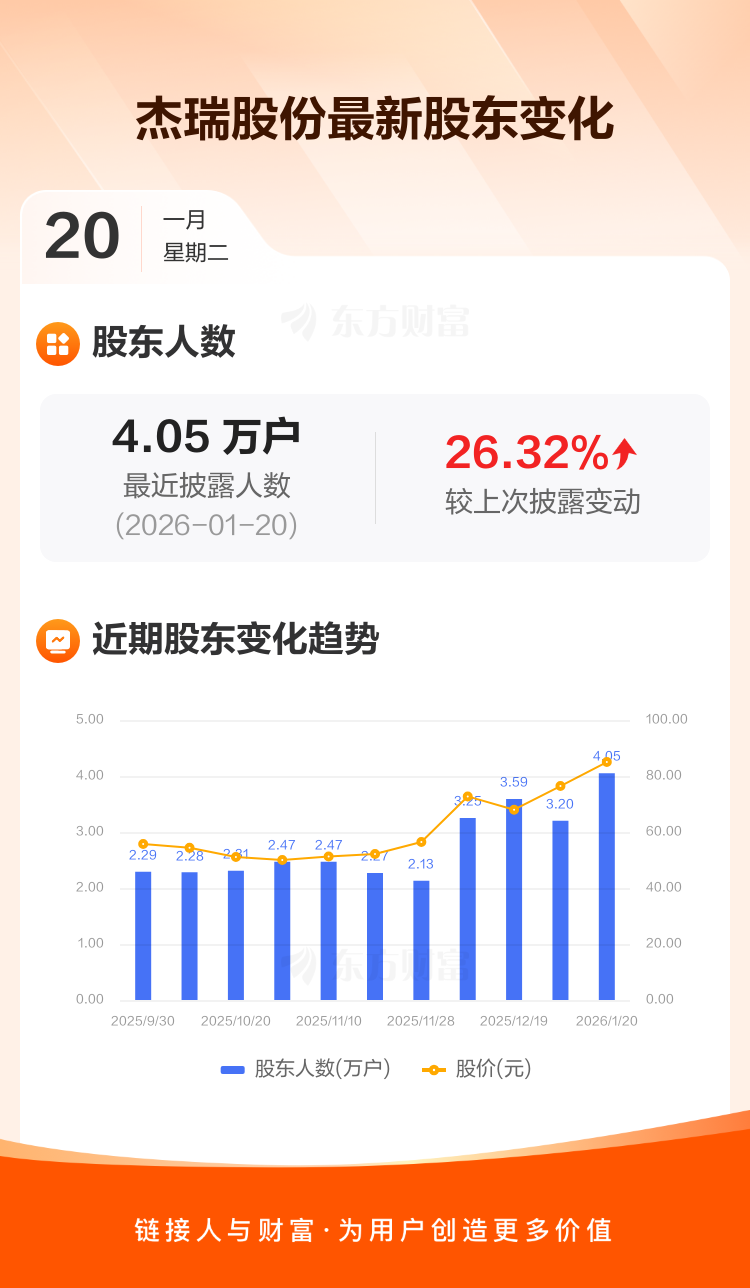 杰瑞股份最新披露数据显示,截至1月20日公司股东户数为4.05万户,较上期(2026年1月9日)增加8428户,增幅为26.32%。户均持有流通股数量由上期的2.16万股下降至1.71万股,户均持股金额由上期的165.39万元减少至145.63万元。