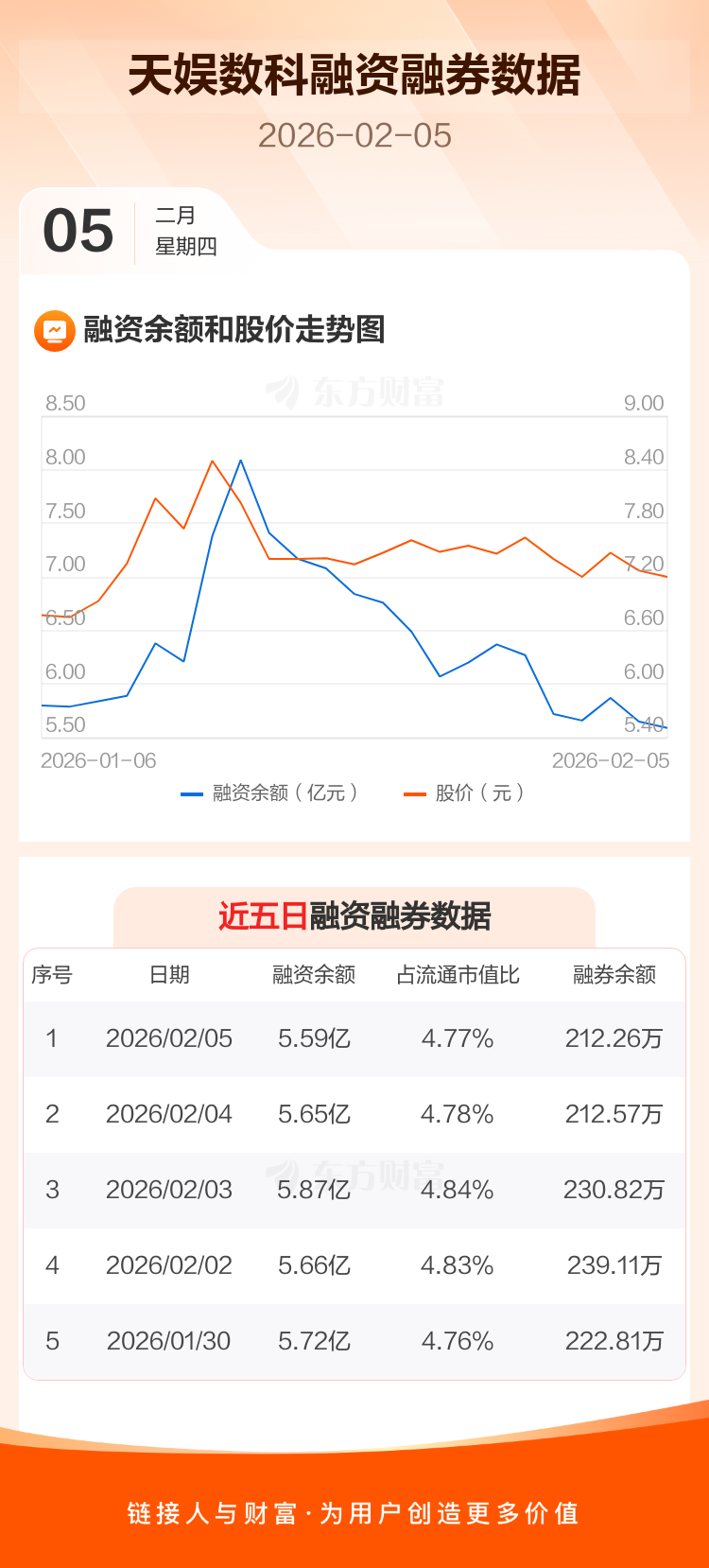 交易所最新数据显示,天娱数科于2026年2月5日获融资买入4320.57万元,融资偿还4995.27万元,当日融资净偿还674.7万元。目前,该股融资余额5.59亿,占流通市值比例为4.77%。