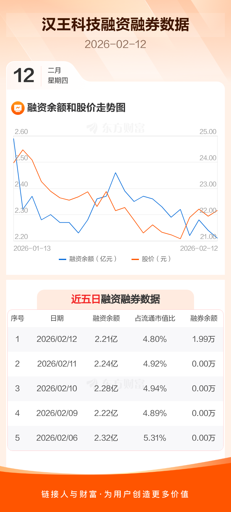 交易所最新数据显示,汉王科技于2026年2月12日获融资买入501.94万元,融资偿还834.48万元,当日融资净偿还332.54万元。目前,该股融资余额2.21亿,占流通市值比例为4.80%。