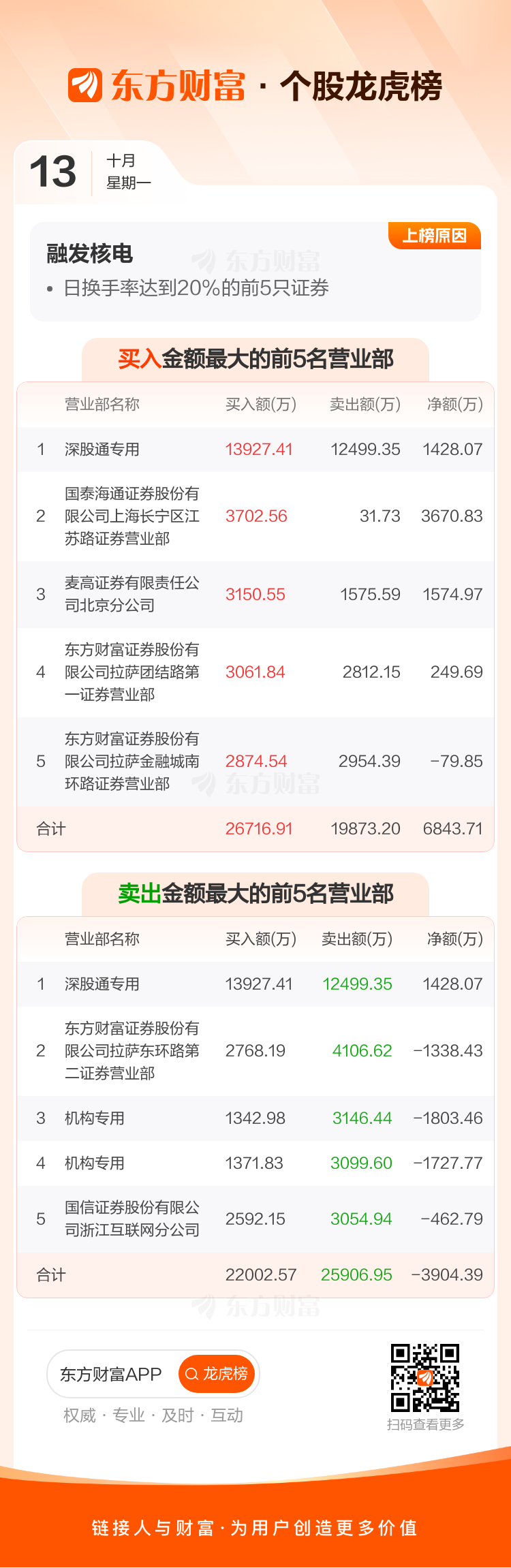 交易所2025年10月13日公布的交易公开信息显示,融发核电因成为日换手率达到20%的前5只证券、连续三个交易日内,涨幅偏离值累计达到20%的证券上榜。融发核电当日收报9元,涨跌幅3.09%,偏离值28.42%,换手率29.14%,成交额32.43亿。异常期间10月9日至10月13日,期间涨幅19.21%,累计偏离值20.49%,区间成交额87.04亿。