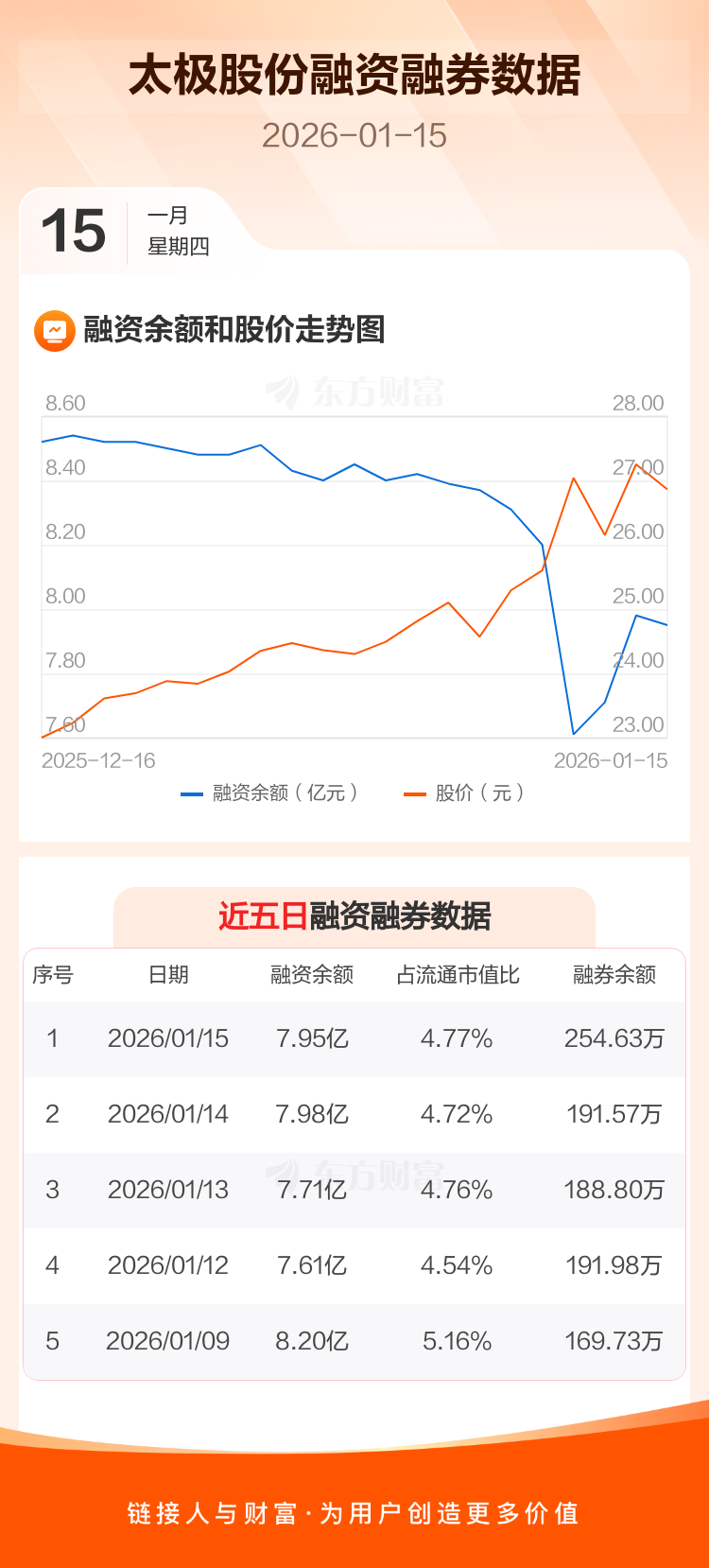 交易所最新数据显示,太极股份于2026年1月15日获融资买入6936.27万元,融资偿还7184.60万元,当日融资净偿还248.34万元。目前,该股融资余额7.95亿,占流通市值比例为4.77%。