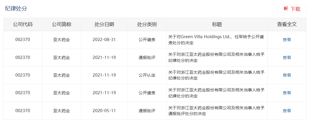 此外,2020年至2022年期间,亚太药业及其时任董监高多次收到深交所公开谴责、通报批评等。