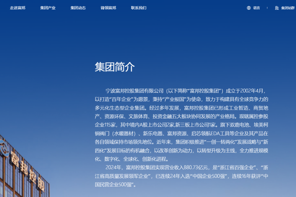 公开资料显示,富邦控股集团已形成工业智造、商贸地产、资源环保、文旅体育、投资金融五大板块协同发展的产业格局,现辖属控参股企业115家,其中A股上市公司2家,新三板公司1家。2024年,富邦控股集团实现营业收入880.73亿元。公司已连续24年入选“中国企业500强”,连续16年获评“中国民营企业500强”。