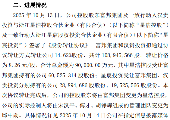 10月13日晚间,亚太药业公告称,10月13日,公司控股股东富邦集团及一致行动人汉贵投资与星浩控股及其一致行动人星宸投资签署了《股份转让协议》,拟通过协议转让方式转让公司14.61%股份,共计1.09亿股,转让价格为8.26元/股,合计总金额为9亿元。