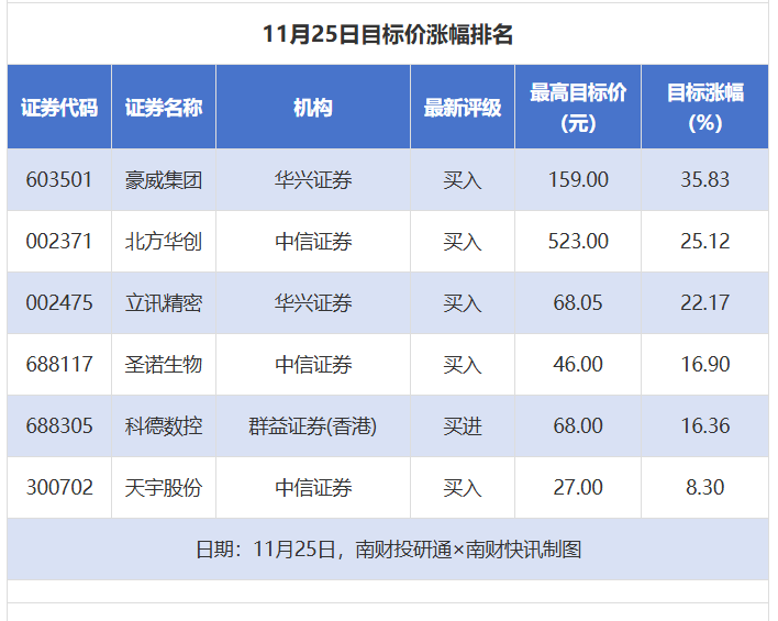 南财投研通数据显示,11月25日,券商给予上市公司目标价共6次,按最新收盘价计算,目标价涨幅排名居前的公司有豪威集团、北方华创、立讯精密,目标价涨幅分别为35.83%、25.12%、22.17%,前两者都属于半导体行业、后者属于消费电子行业。