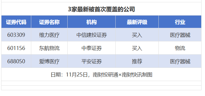 首次覆盖方面,11月25日券商共给出了3次首次覆盖,其中维力医疗获得中信建投证券给予“买入”评级,东航物流获得中泰证券给予“买入”评级,爱博医疗获得平安证券给予“推荐”评级。