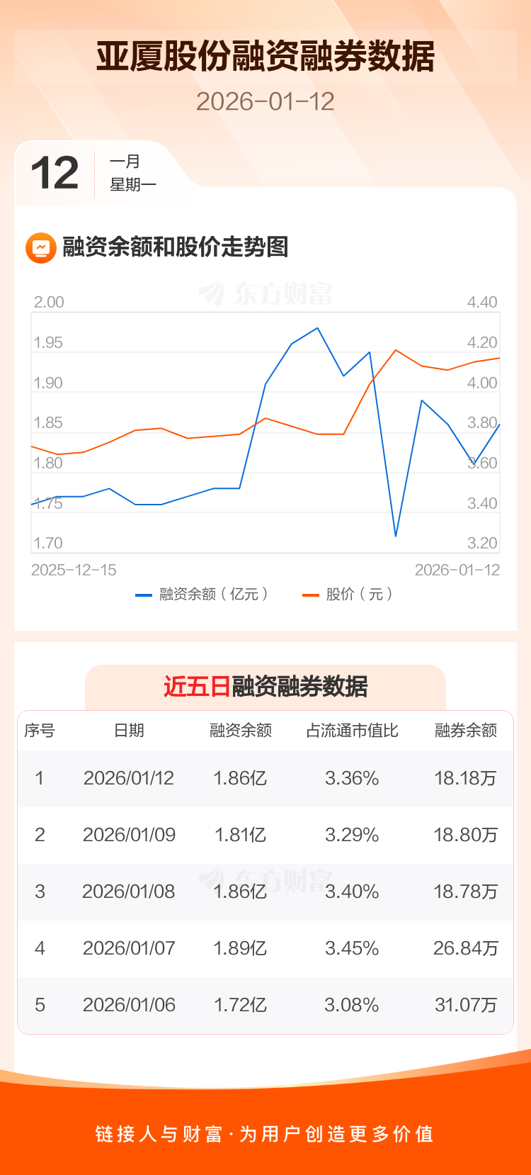 交易所最新数据显示,亚厦股份于2026年1月12日获融资买入1863.36万元,融资偿还1413.07万元,当日融资净买入450.28万元。目前,该股融资余额1.86亿,占流通市值比例为3.36%。