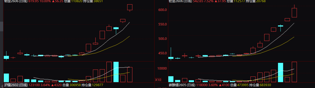 消息面上,贵金属价格继续全面上涨。今天上午,国内贵金属期货再度普遍大幅上涨,部分品种涨势进一步加速,其中广期所铂主力合约盘中触及涨停,盘中最高触及619.95元/克,再创该合约上市以来新高;广期所钯主力合约上午盘中也触及涨停,盘中最高触及555.15元/克,再创该合约上市以来新高;上期所白银期货主力合约盘中涨幅超过4%,盘中再创历史新高;上期所黄金期货主力合约也强势突破,盘中突破前段时间高点,创出历史新高。