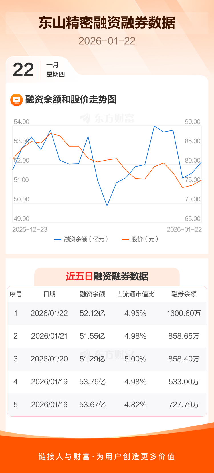 交易所最新数据显示,东山精密于2026年1月22日获融资买入3.28亿元,融资偿还2.71亿元,当日融资净买入5659.41万元。目前,该股融资余额52.12亿,占流通市值比例为4.95%。