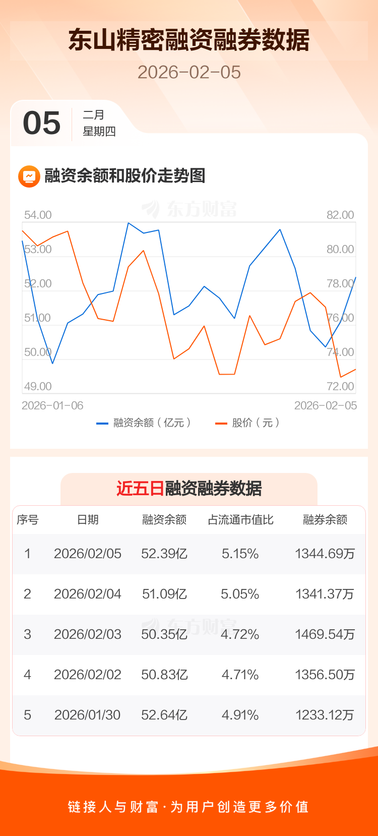 交易所最新数据显示,东山精密于2026年2月5日获融资买入6.30亿元,融资偿还5.00亿元,当日融资净买入1.3亿元。目前,该股融资余额52.39亿,占流通市值比例为5.15%。