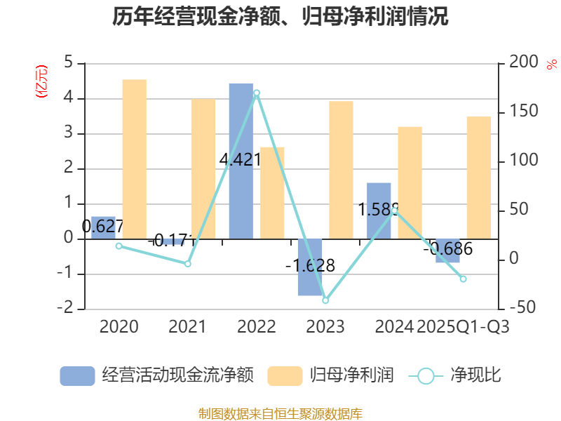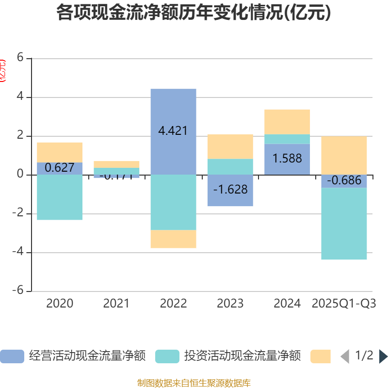 2025年前三季度,公司经营活动现金流净额为-6855.29万元,同比减少5666.62万元;筹资活动现金流净额1.98亿元,同比增加2.97亿元;投资活动现金流净额-3.69亿元,上年同期为7678.27万元。