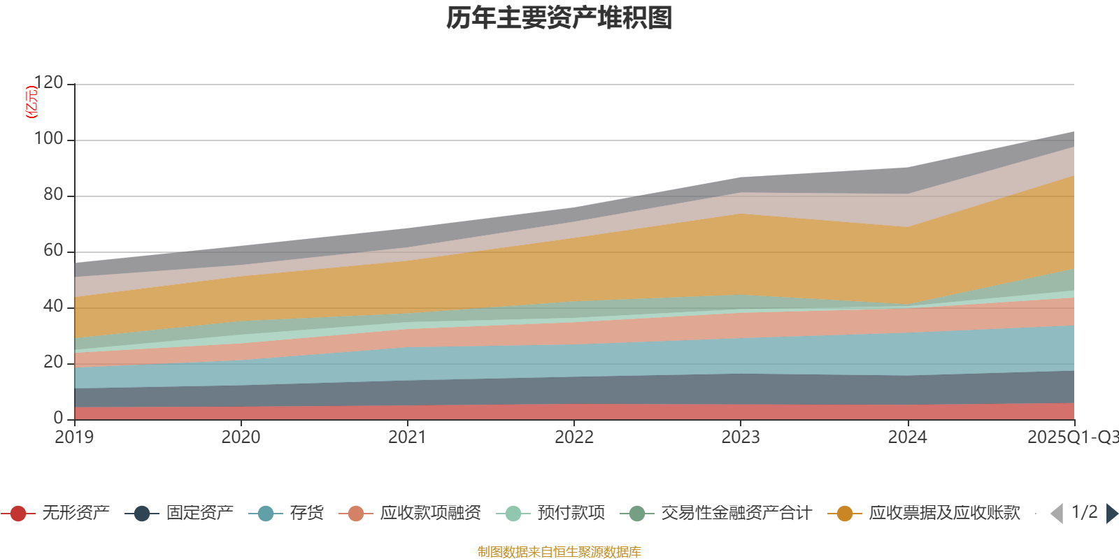 资产重大变化方面,截至2025年三季度末,公司交易性金融资产合计较上年末增加1088.7%,占公司总资产比重上升6.86个百分点;其他流动资产较上年末减少96.1%,占公司总资产比重下降3.43个百分点;货币资金较上年末减少12.85%,占公司总资产比重下降3.12个百分点;应收票据及应收账款较上年末增加20.55%,占公司总资产比重上升1.69个百分点。