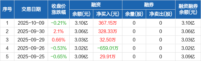融资方面,当日融资买入1625.62万元,融资偿还1258.48万元,融资净买入367.15万元,连续3日净买入累计727.97万元。融券方面,融券卖出0股,融券偿还0股,融券余量0股,融券余额0元。融资融券余额合计3.1亿元。