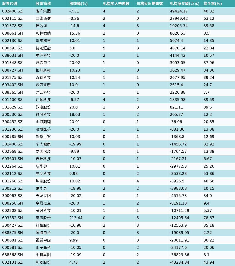 21智讯1月15日电,南财金融终端数据显示,因当日异动登上龙虎榜的个股中,35只沪深A股龙虎榜出现了机构的身影,机构合计净卖出86461.48万元,具体来看,机构净买入15只个股,净卖出20只个股。其中,机构净买入前三分别为省广集团(002400.SZ)、三维通信(002115.SZ)与通达海(301378.SZ),详情见下图:机构净卖出的个股中,前三分别为利欧股份(002131.SZ)、中科星图(688568.SH)与山子高科(000981.SZ)。