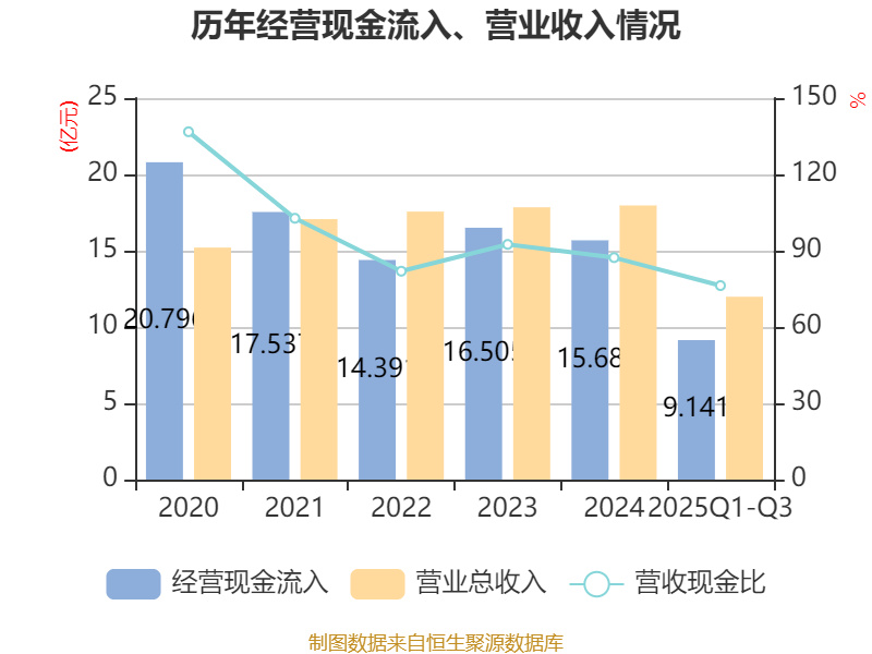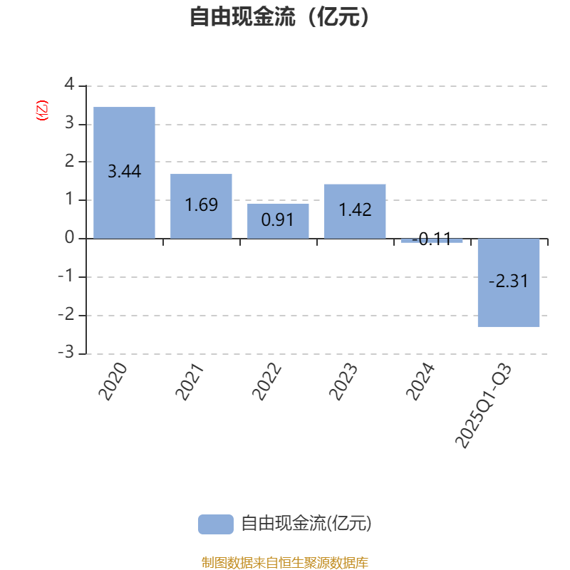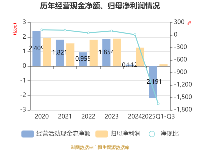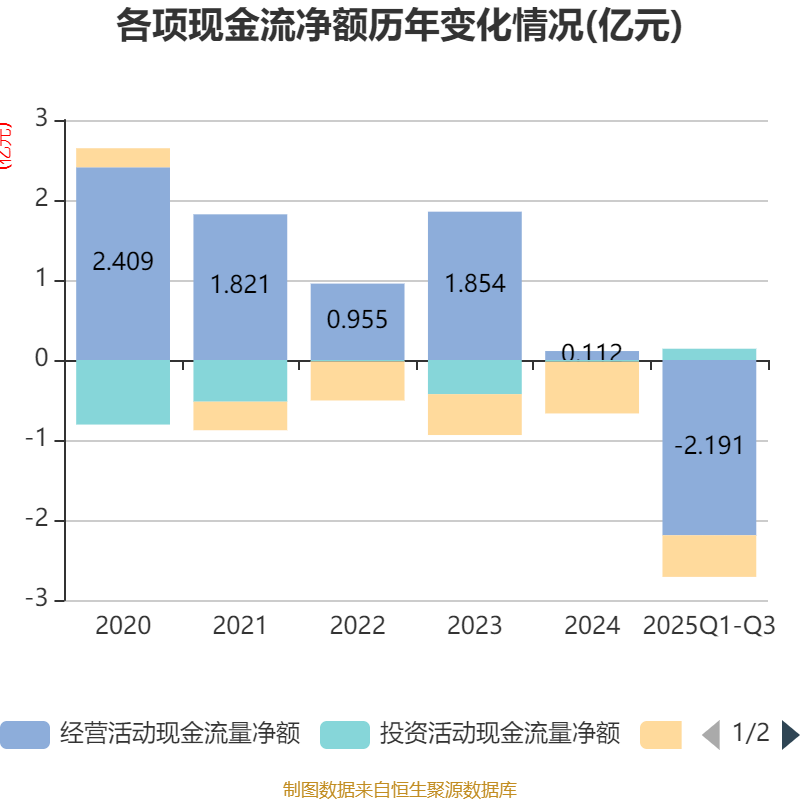 2025年前三季度,公司经营活动现金流净额为-2.19亿元,同比增加1.07亿元;筹资活动现金流净额-5203.42万元,同比增加2378.55万元;投资活动现金流净额1412.31万元,上年同期为-105.51万元。