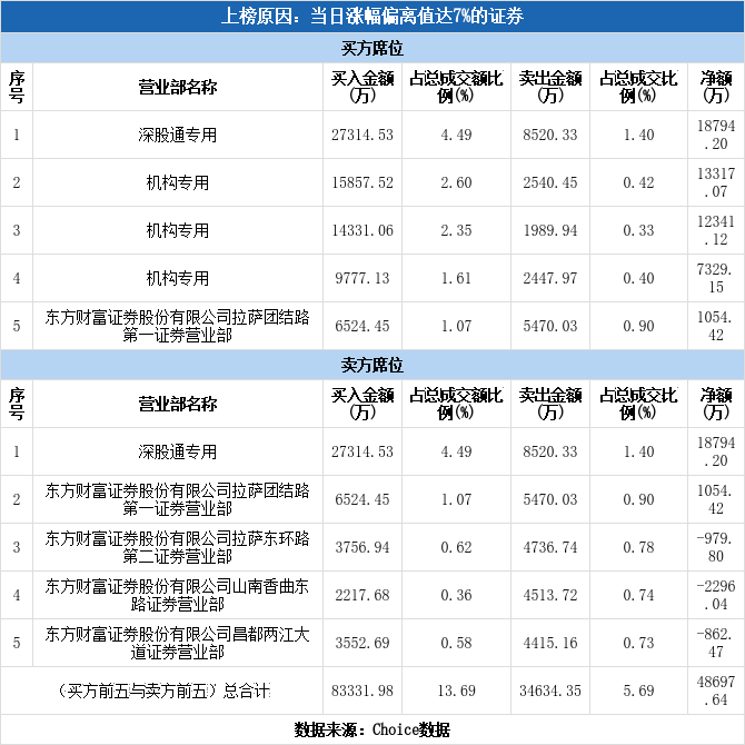 今日龙虎榜单上出现了深股通的身影,占据了买一、卖一的位置,净买入1.88亿元,占当日成交总额的3.09%,是获深股通净买额最高的个股。除此之外深股通还参与到了通宇通讯、博纳影业、巨轮智能等12只个股中,其中7家呈现深股通净买入,获净买入最多的是博纳影业,净买额为5347.08万元;5家呈现深股通净卖出,遭净卖出最高的为通宇通讯,净卖额为1.46亿元。