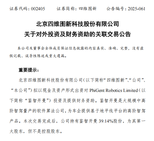 9月29日晚间,四维图新公告称,公司拟对PhiGent Robotics Limited(以下简称鉴智开曼)进行投资并提供财务资助,以获得鉴智开曼39.14%的股份,成为其第一大股东。