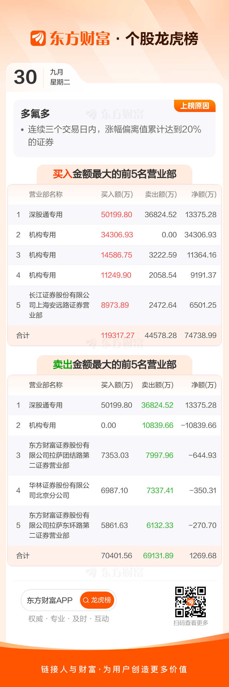 交易所2025年9月30日公布的交易公开信息显示,多氟多因成为日换手率达到20%的前5只证券、连续三个交易日内,涨幅偏离值累计达到20%的证券上榜。多氟多当日收报20.5元,涨跌幅5.67%,偏离值24.01%,换手率24.01%,成交额53.27亿。异常期间9月26日至9月30日,期间涨幅22.98%,累计偏离值22.57%,区间成交额90.76亿。