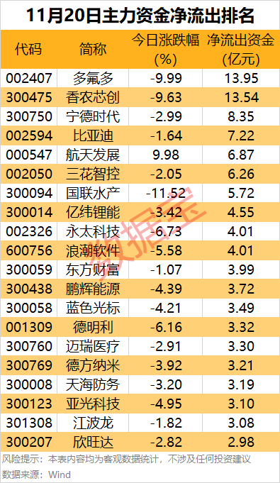 化工股多氟多和HBM概念股香农芯创主力资金净流出均超13亿元。多氟多跌停,龙虎榜数据显示,上榜营业部席位全天成交16.65亿元,占当日总成交金额比例为20.51%,合计净卖出3.04亿元。