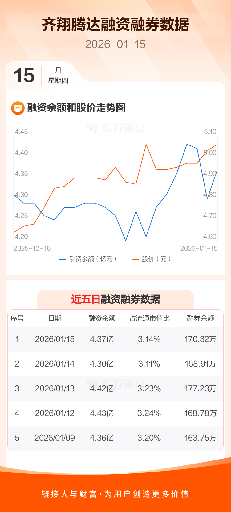 交易所最新数据显示,齐翔腾达于2026年1月15日获融资买入1368.81万元,融资偿还663.95万元,当日融资净买入704.86万元。目前,该股融资余额4.37亿,占流通市值比例为3.14%。
