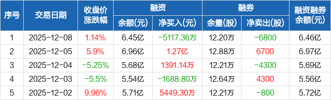 雷科防务:融资净偿还5117.36万元,融资余额6.45亿元(12-08)