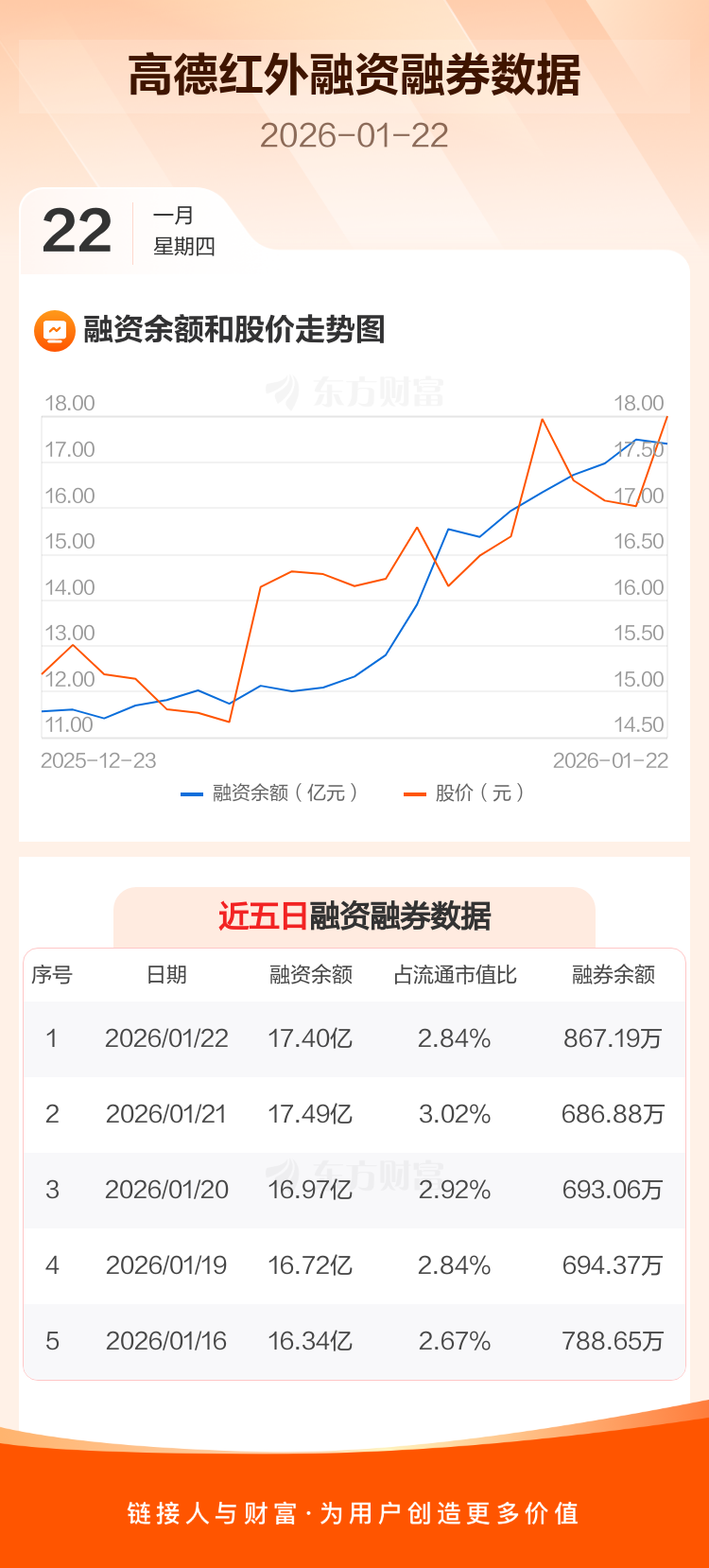 交易所最新数据显示,高德红外于2026年1月22日获融资买入2.12亿元,融资偿还2.21亿元,当日融资净偿还886.78万元。目前,该股融资余额17.40亿,占流通市值比例为2.84%。