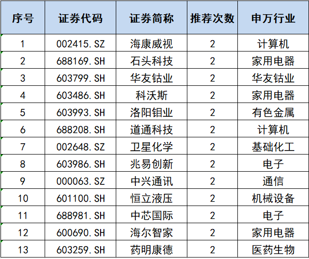从推荐机构数量来看,海康威视、石头科技、华友钴业、科沃斯、洛阳钼业、药明康德、卫星化学等多股获2家券商推荐,包括光大证券、国金证券、开源证券、中国银河等。