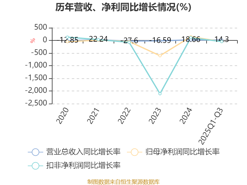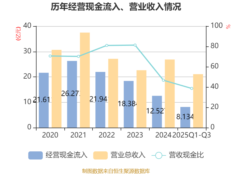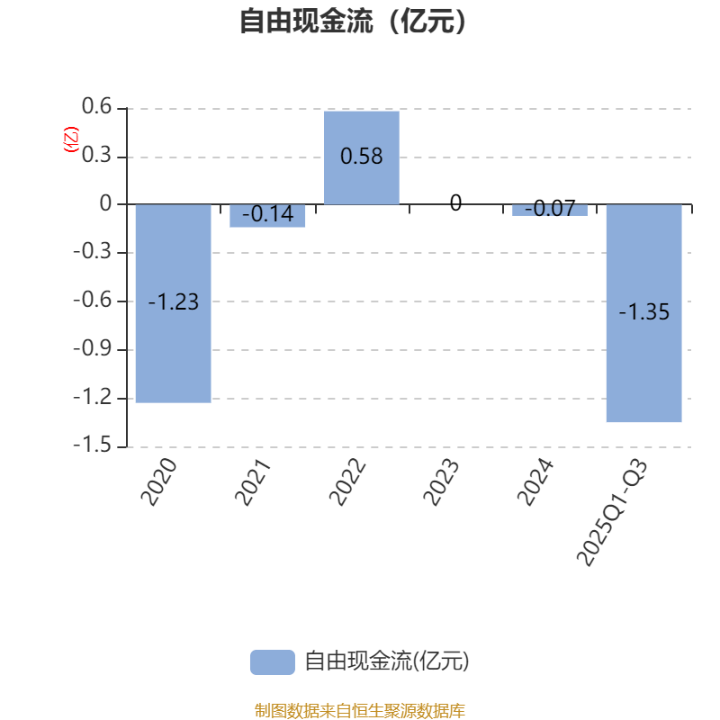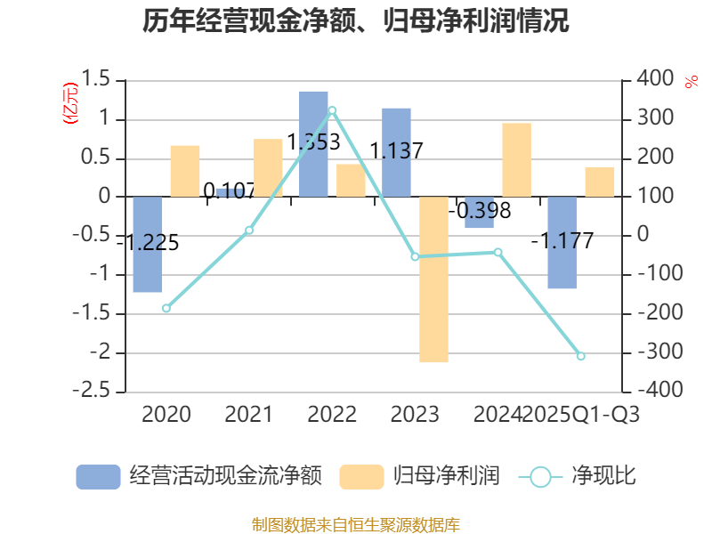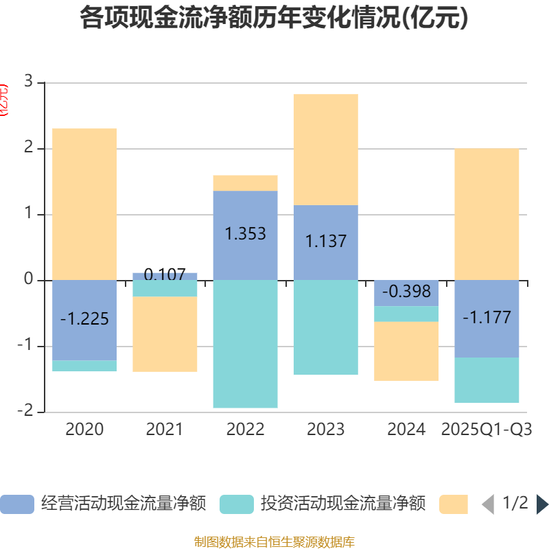 2025年前三季度,公司经营活动现金流净额为-1.18亿元,同比减少6442.03万元;筹资活动现金流净额2亿元,同比增加2.58亿元;投资活动现金流净额-6882.84万元,上年同期为-1634.62万元。