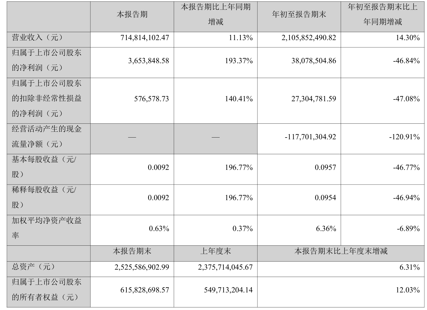 中证智能财讯毅昌科技(002420)10月22日披露2025年第三季度报告。前三季度公司实现营业总收入21.06亿元,同比增长14.30%;归母净利润3807.85万元,同比下降46.84%;扣非净利润2730.48万元,同比下降47.08%;经营活动产生的现金流量净额为-1.18亿元,上年同期为-5328.1万元;报告期内,毅昌科技基本每股收益为0.0957元,加权平均净资产收益率为6.36%。