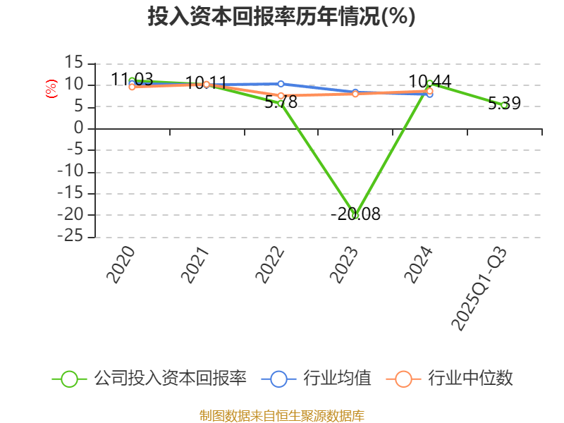 盈利能力方面, 2025年前三季度公司加权平均净资产收益率为6.36%,同比下降6.89个百分点。公司2025年前三季度投入资本回报率为5.39%,较上年同期下降2.68个百分点。