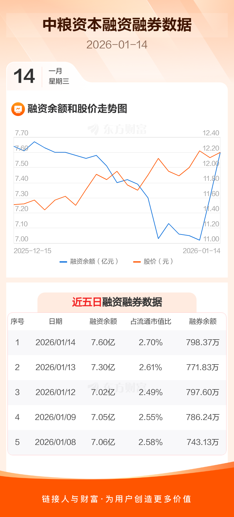 交易所最新数据显示,中粮资本于2026年1月14日获融资买入1.06亿元,融资偿还7660.64万元,当日融资净买入2974.6万元。目前,该股融资余额7.60亿,占流通市值比例为2.70%。