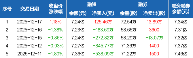 启明星辰融资融券信息显示,2025年12月17日融资净买入125.46万元;融资余额7.24亿元,较前一日增加0.17%。