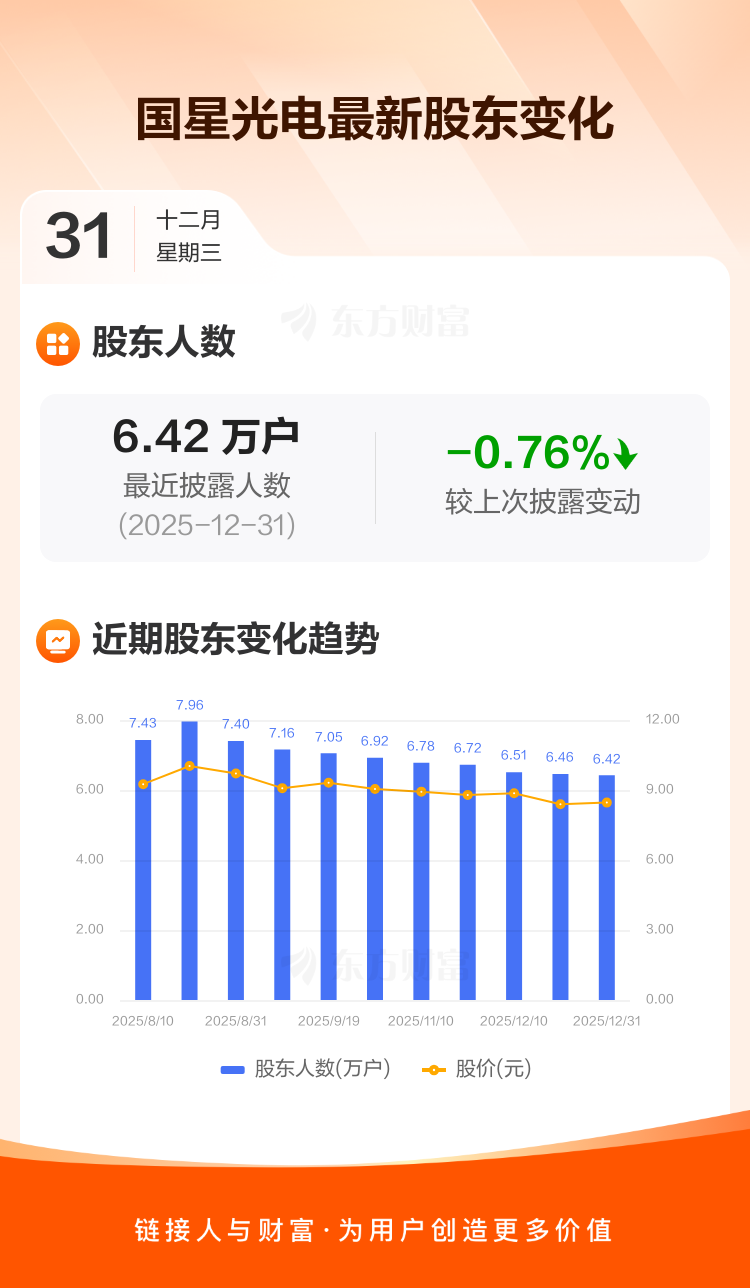 国星光电最新披露数据显示,截至12月31日公司股东户数为6.42万户,较上期(2025年12月19日)减少492户,降幅为0.76%。户均持有流通股数量由上期的9567股上升至9640股,户均持股金额由上期的8.03万元增加至8.16万元。
