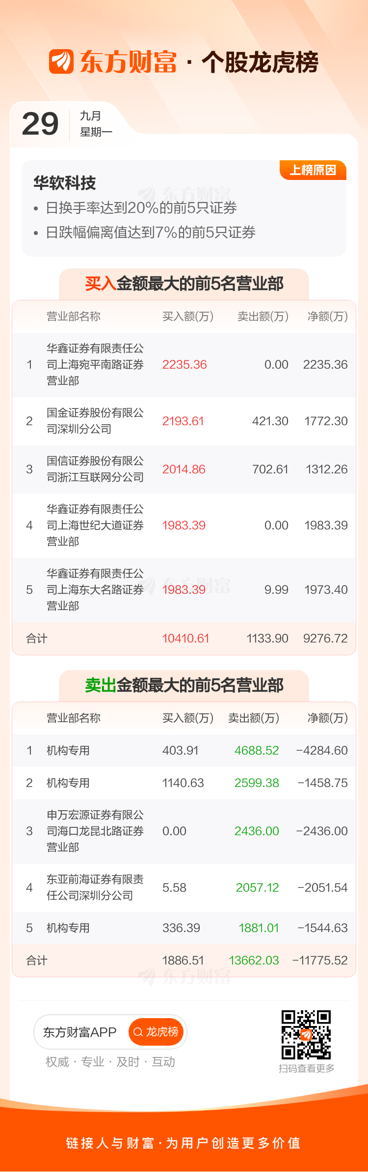 交易所2025年9月29日公布的交易公开信息显示,华软科技因成为日换手率达到20%的前5只证券、日跌幅偏离值达到7%的前5只证券上榜。华软科技当日收报7.9元,涨跌幅-10.02%,偏离值31.89%,换手率31.36%,成交额15.56亿。