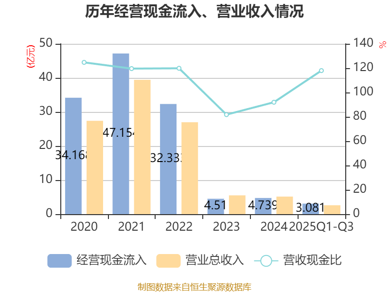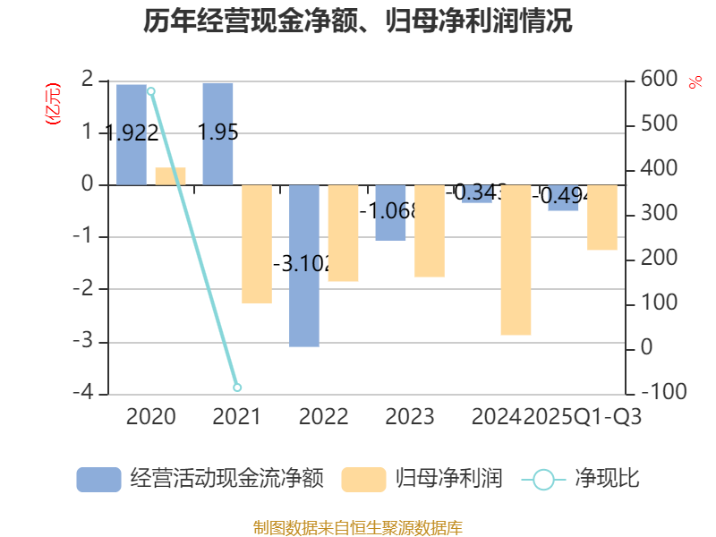 2025年前三季度,公司经营活动现金流净额为-4943.25万元,同比减少3081.46万元;筹资活动现金流净额-6444.57万元,同比减少6645.19万元;投资活动现金流净额6428.2万元,上年同期为-5432.1万元。