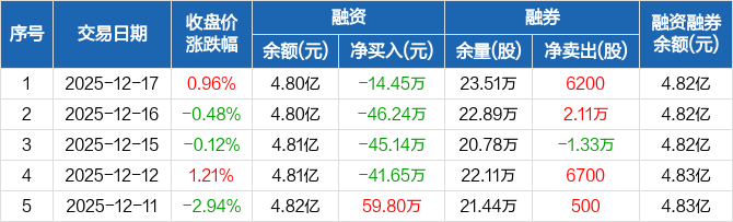 融资方面,当日融资买入541.63万元,融资偿还556.08万元,融资净偿还14.45万元,连续4日净偿还累计147.48万元。融券方面,融券卖出6900股,融券偿还700股,融券余量23.51万股,融券余额197.01万元。融资融券余额合计4.82亿元。