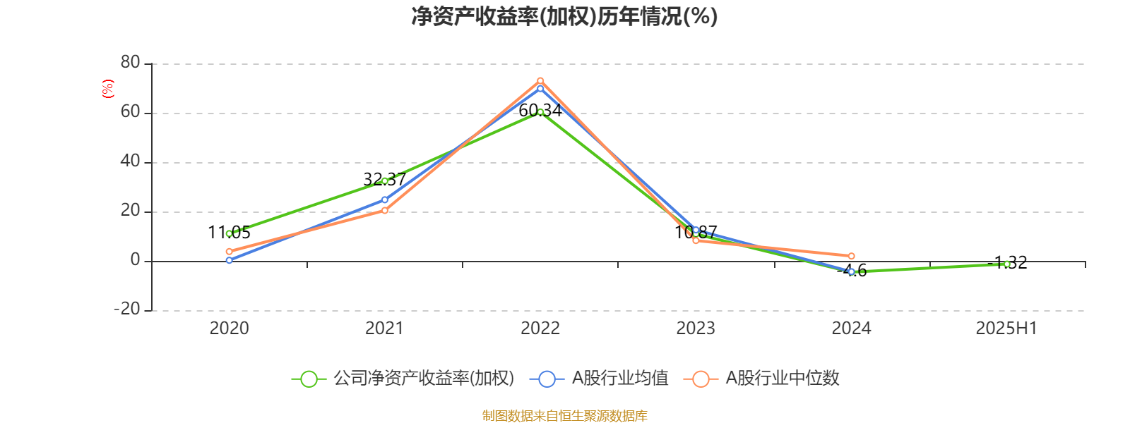 2025年上半年,公司平均净资产收益率为-1.32%,较上年同期上升0.34个百分点。