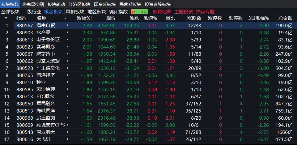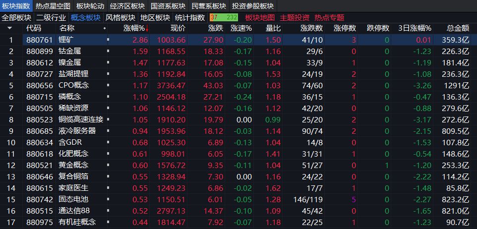 A股三大指数集体上涨,创业板指上涨逾1%。盘面上,能源金属、锂矿概念、CPO概念、化肥行业、旅游酒店、航空机场、氟化工、医药商业位于涨幅榜前列;海南板块、时空大数据、电子化学品、电子后视镜、船舶制造表现不佳,领跌市场。其中,商业航天早盘调整后逐渐企稳回升。