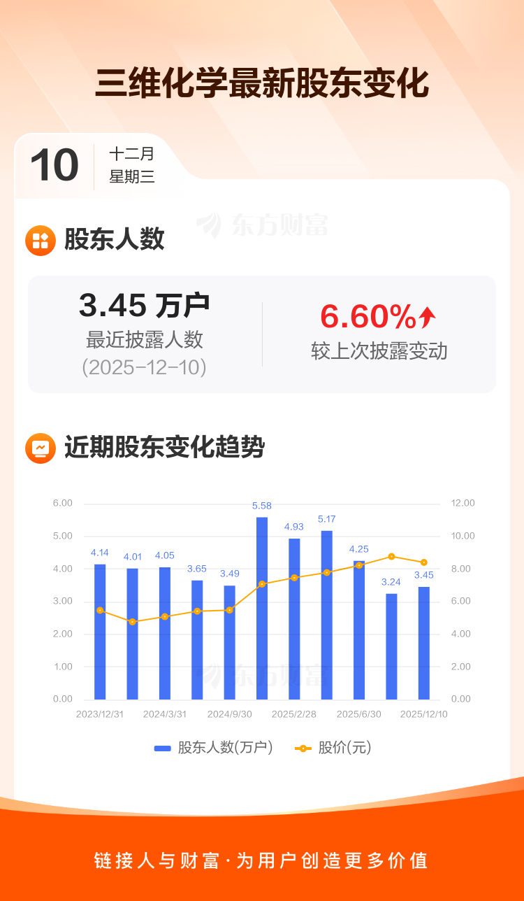 三维化学最新披露数据显示,截至12月10日公司股东户数为3.45万户,较上期(2025年9月30日)增加2139户,增幅为6.60%。户均持有流通股数量由上期的1.94万股下降至1.82万股,户均持股金额由上期的17.00万元减少至15.29万元。