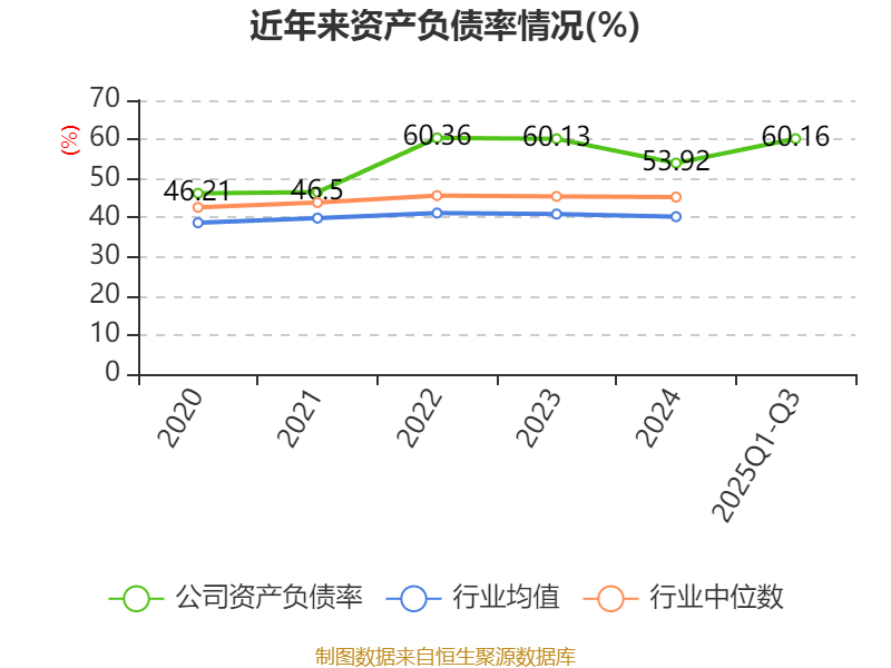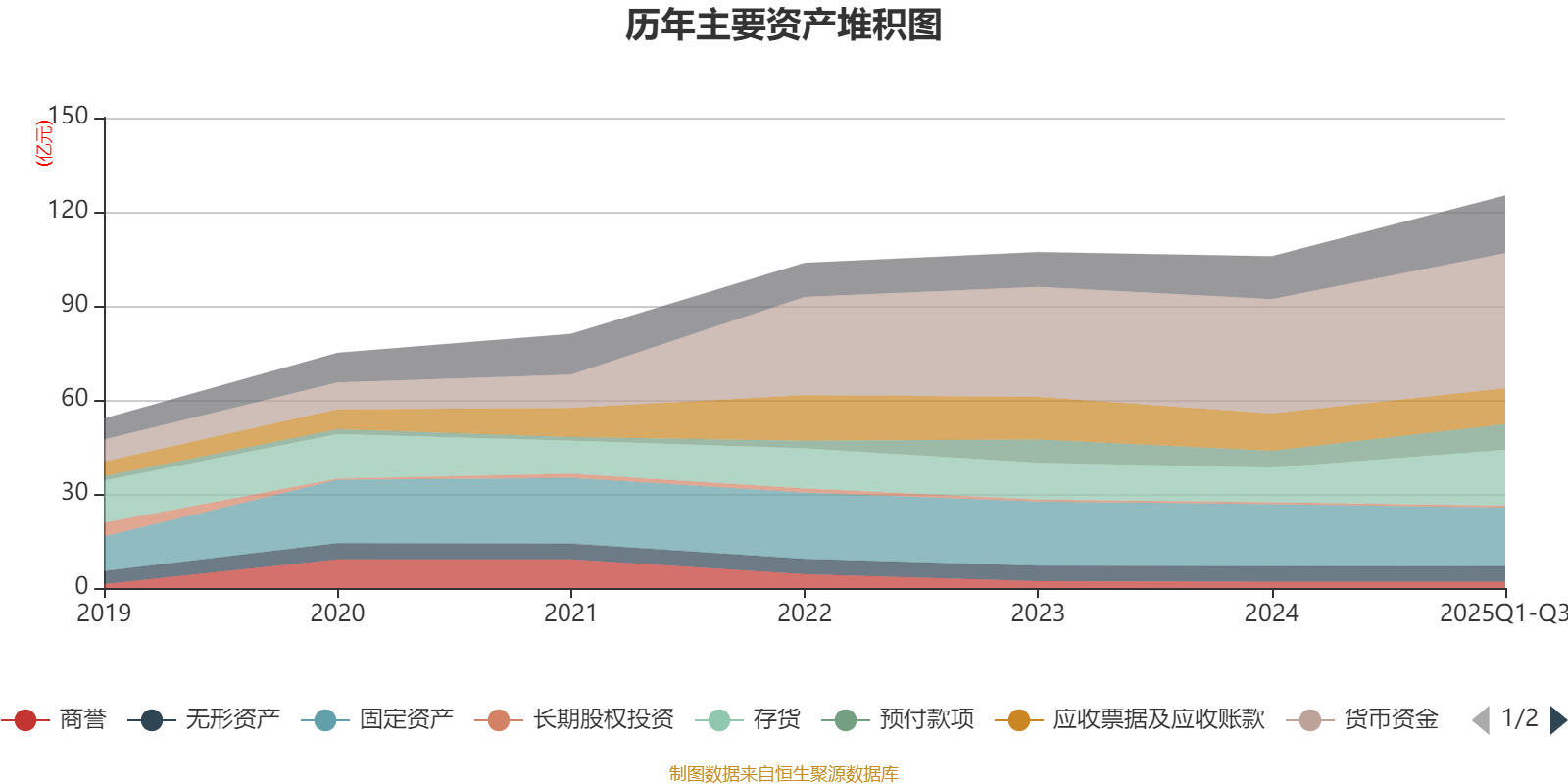 资产重大变化方面,截至2025年三季度末,公司存货较上年末增加61.75%,占公司总资产比重上升3.82个百分点;固定资产较上年末减少4.99%,占公司总资产比重下降3.68个百分点;应收票据及应收账款较上年末减少2.8%,占公司总资产比重下降2个百分点;预付款项较上年末增加49.2%,占公司总资产比重上升1.33个百分点。