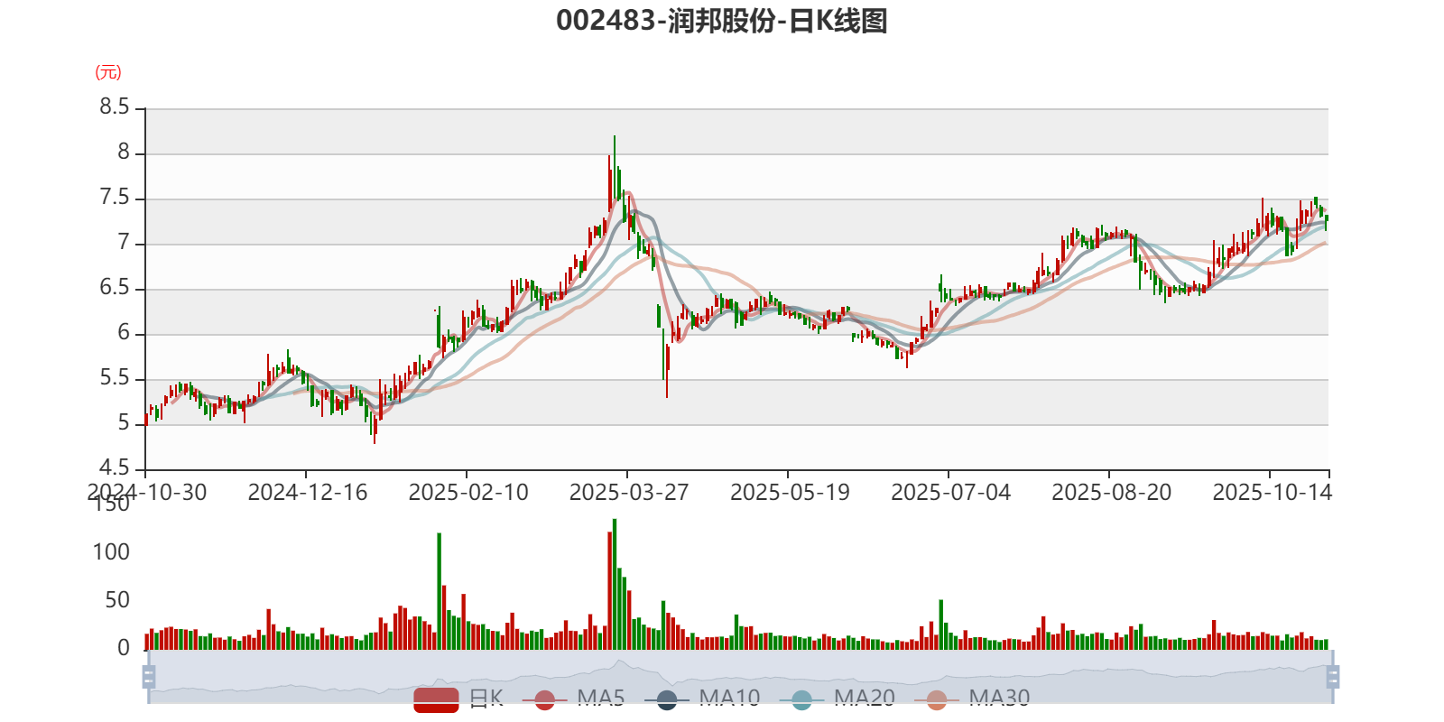 中证智能财讯润邦股份(002483)10月30日披露2025年第三季度报告。前三季度公司实现营业总收入46.96亿元,同比下降8.79%;归母净利润2.24亿元,同比下降12.06%;扣非净利润2.19亿元,同比下降1.49%;经营活动产生的现金流量净额为6.17亿元,同比增长199.86%;报告期内,润邦股份基本每股收益为0.253元,加权平均净资产收益率为5.09%。