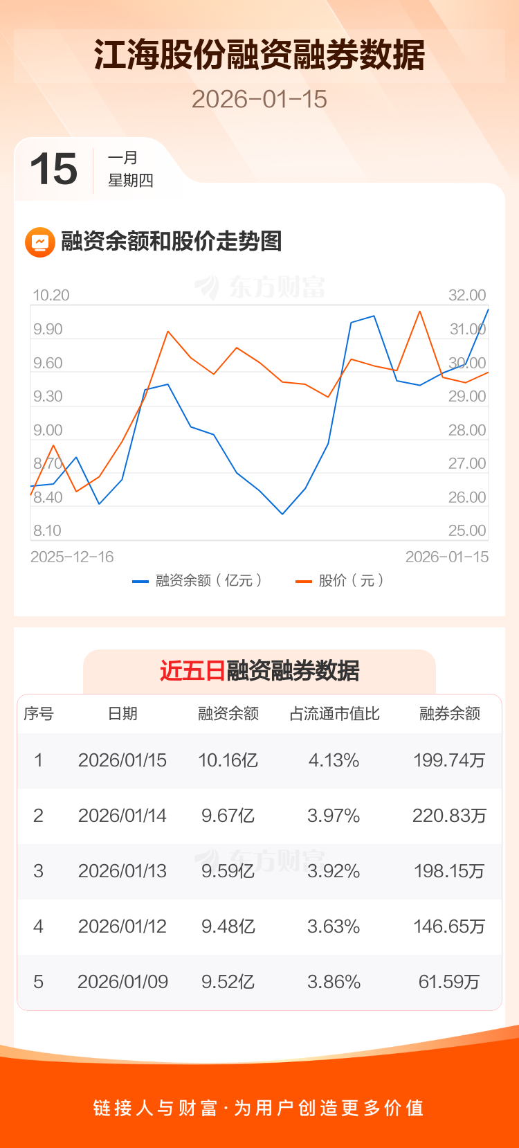 交易所最新数据显示,江海股份于2026年1月15日获融资买入1.11亿元,融资偿还6163.54万元,当日融资净买入4916.04万元。目前,该股融资余额10.16亿,占流通市值比例为4.13%。