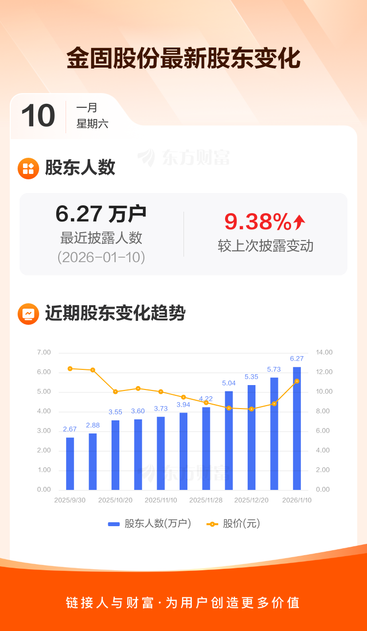 金固股份:截至1月10日最新股东户数6.27万户,较上期增加9.38%
