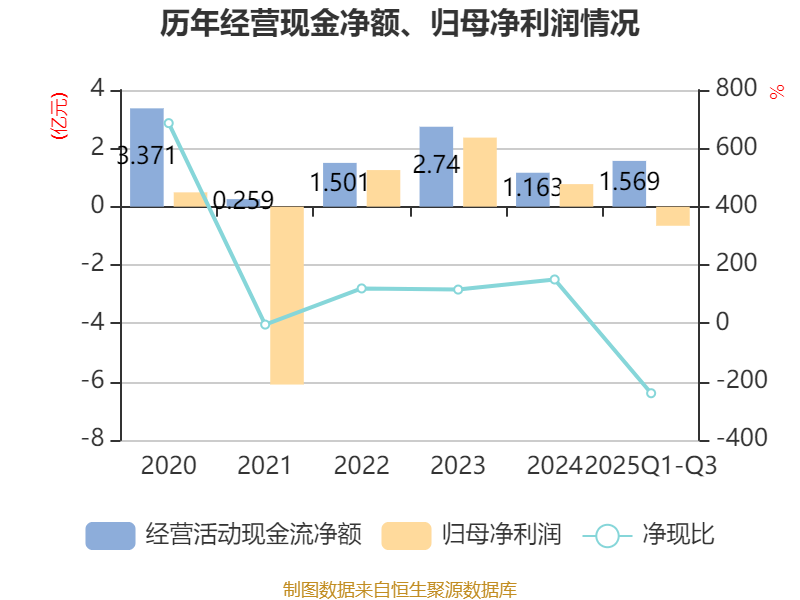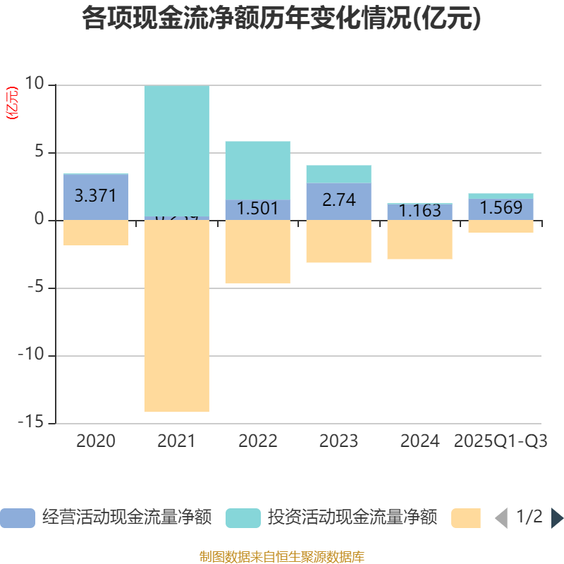 2025年前三季度,公司经营活动现金流净额为1.57亿元,同比增长142.39%;筹资活动现金流净额-9377.05万元,同比增加6847.44万元;投资活动现金流净额3943.54万元,上年同期为1608.53万元。