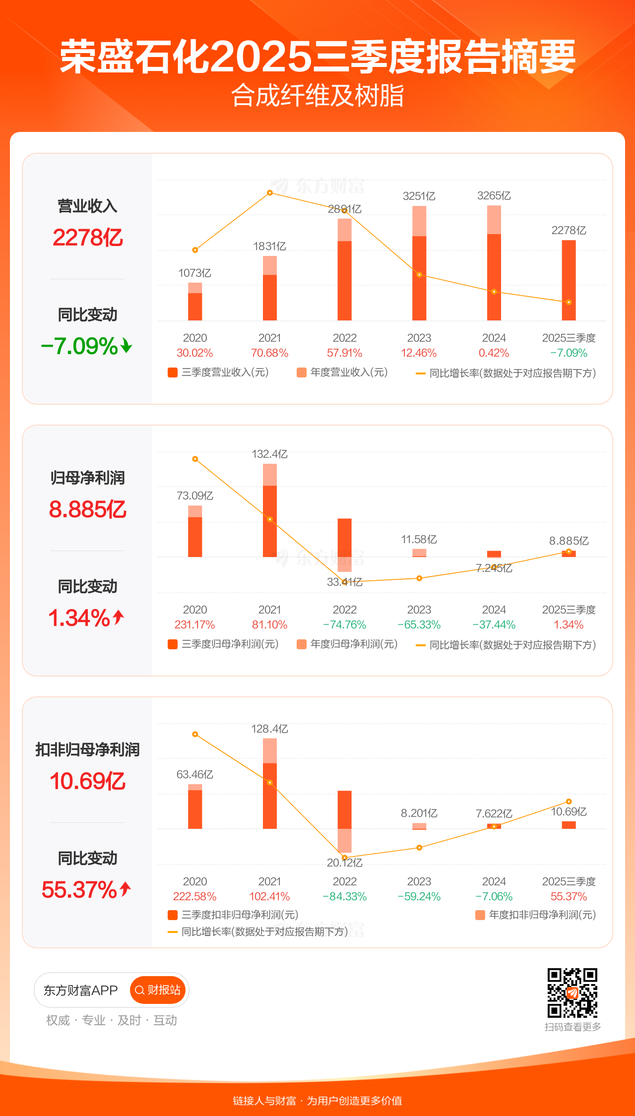 荣盛石化10月30日发布2025年三季报显示,公司前三季实现营业收入2278.15亿元,同比下滑7.09%;归母净利润8.88亿元,同比增长1.34%;扣非归母净利润10.69亿元,同比增长55.37%。