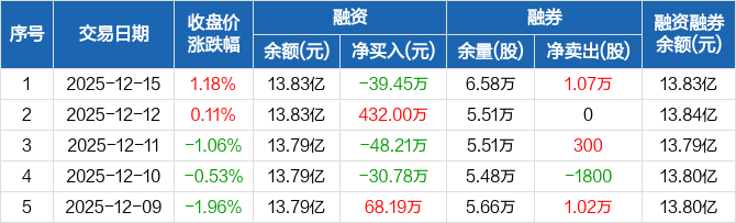 融资方面,当日融资买入1641.73万元,融资偿还1681.18万元,融资净偿还39.45万元。融券方面,融券卖出1.07万股,融券偿还0股,融券余量6.58万股,融券余额62.18万元。融资融券余额合计13.83亿元。